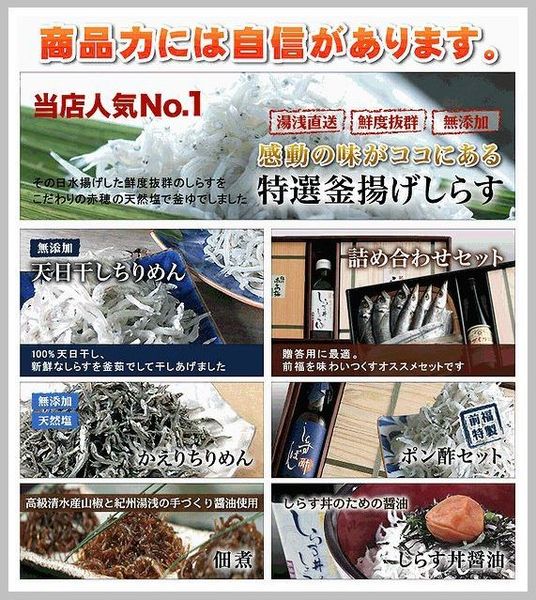 ◆【魚本来の旨味を生かした製品造り】をモットーに、原魚は紀伊水道産を使用し、水は有田川伏流水の天然ろ過された地下水をさらに殺菌ろ過した軟水、塩は赤穂の天然塩でしらすを茹で上げます。